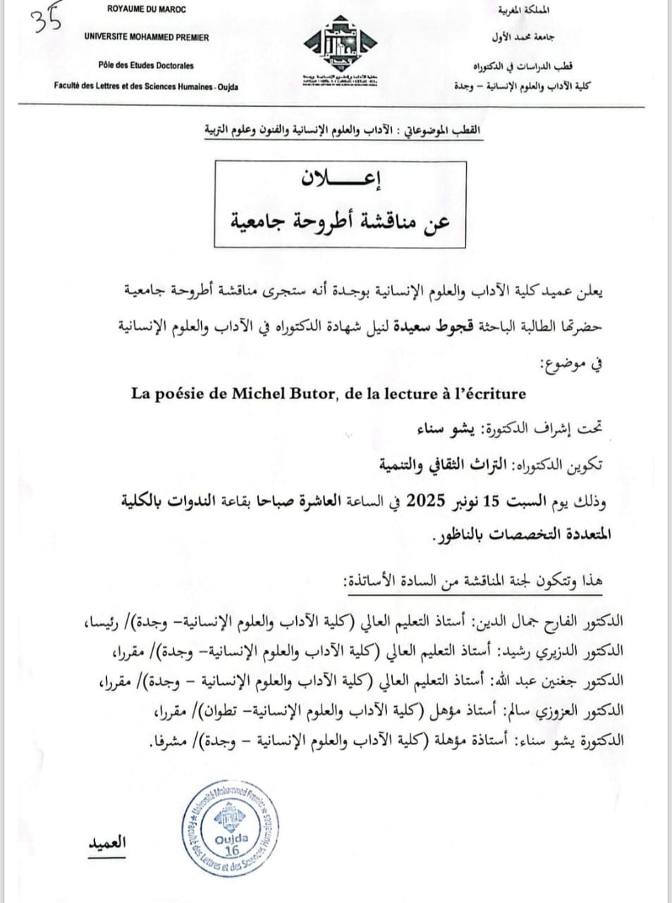 اعلان عن مناقشة اطروحة جامعية