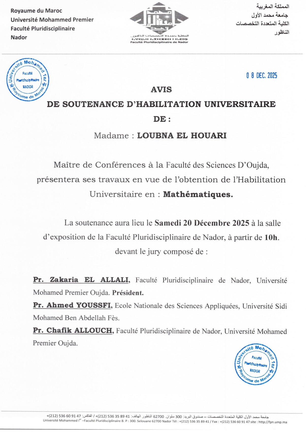 اعلان عن مناقشة ملف التأهيل الجامعي عز الدين العمراوي Imane MERIMI MOHAMED BOUDCHICHE IBTISSAM ARRASSEN LOUBNA EL HOUARI SANAE DAHBI HSSINI IMANE