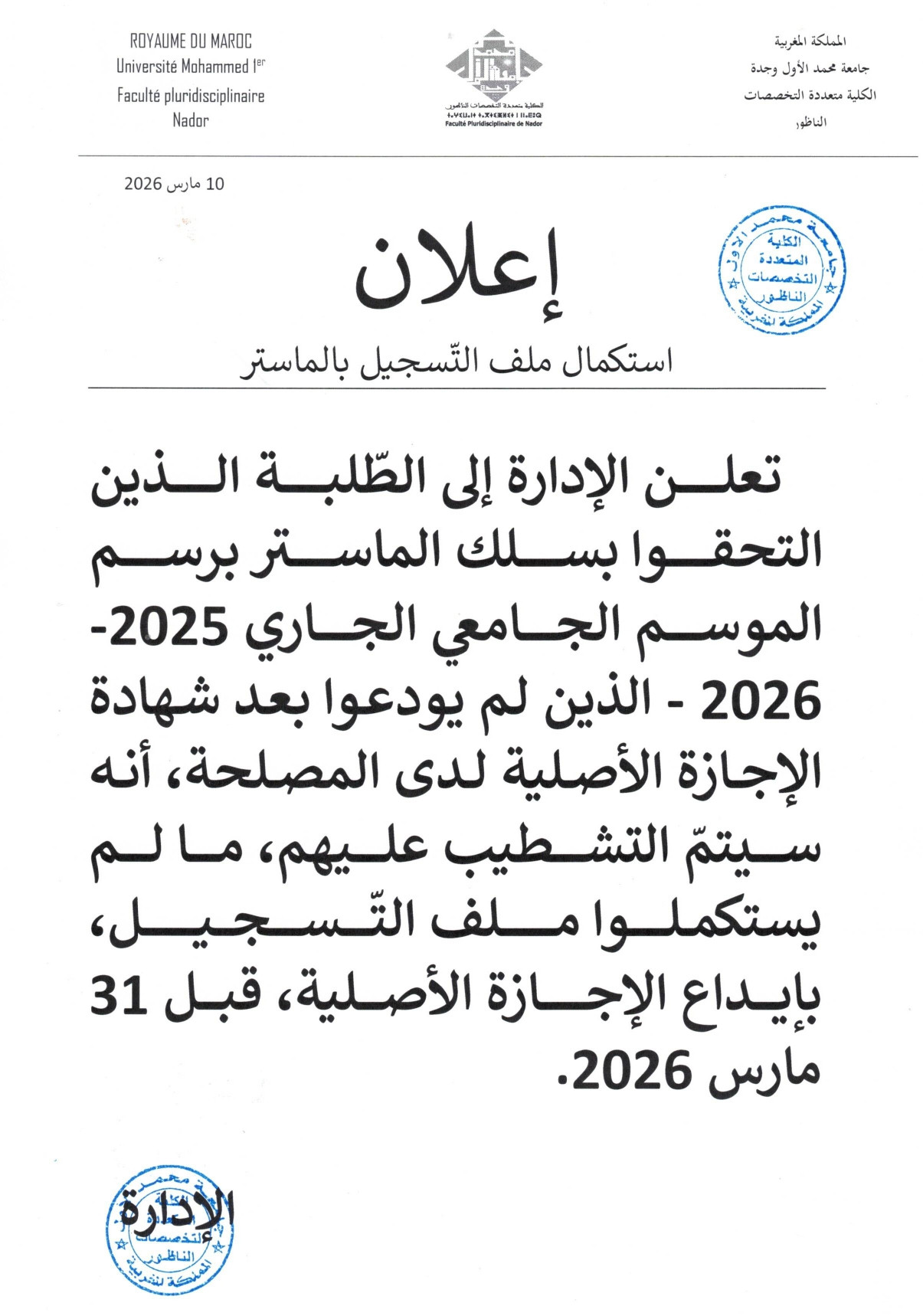 اعلان استكمال ملف التسجيل بالماستر