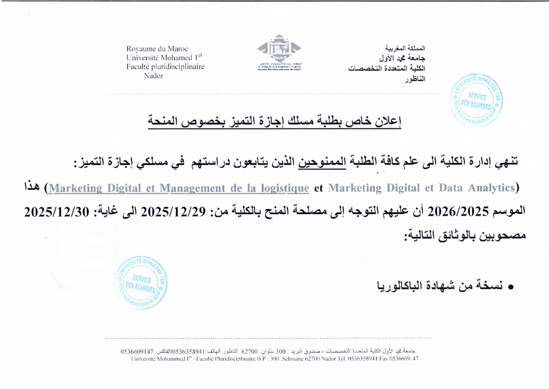 اعلان خاص بطلبة إجازة التميز بخصوص المنحة