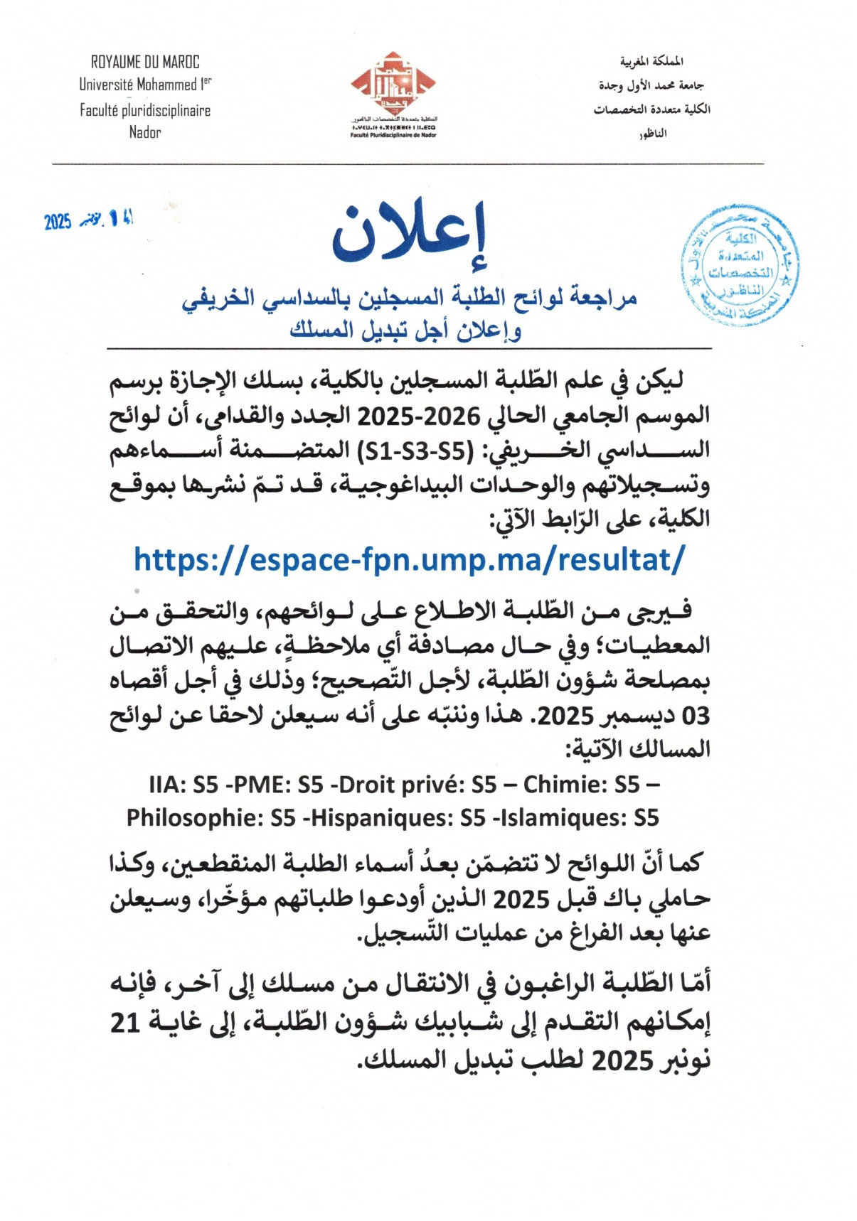 اعلان مراجعة لوائح الطلبة المسجلين بالسداسي الخريفي واعلان أجل تغيير المسلك https://espace-fpn.ump.ma/resultat/
