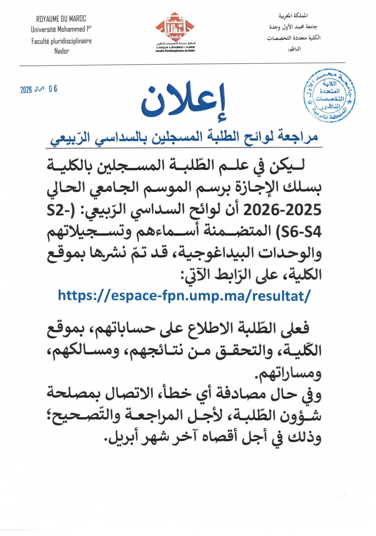 اعلان مراجعة لوائح الطلبة المسجلين بالسداسي الربيعي