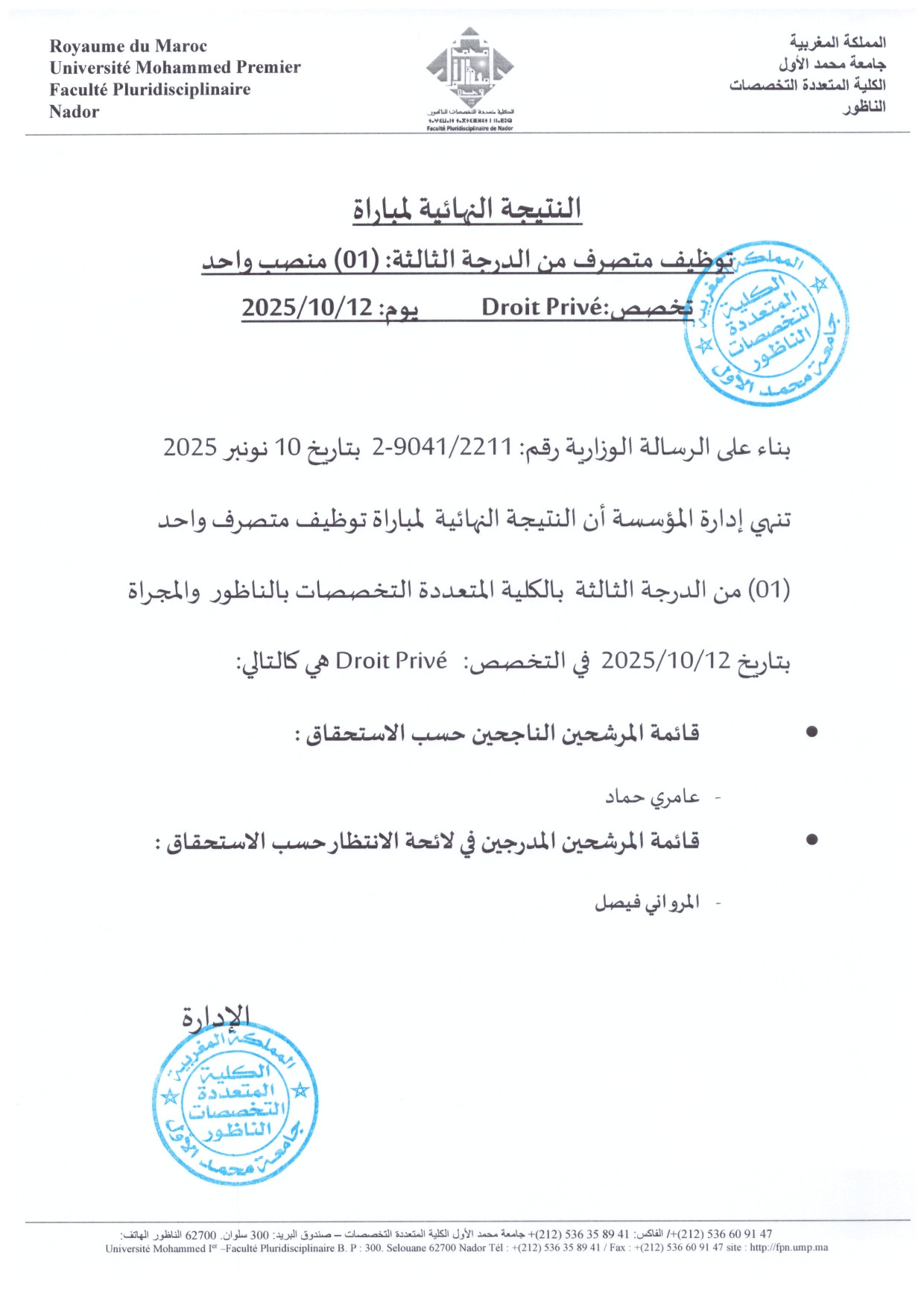 النتيجة النهائية لمباراة متصرف من الدرجة الثالثة في تخصص:Droit Privé دورة 12/10/2025
