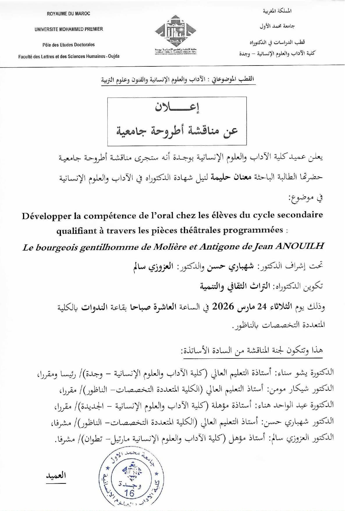 Avis de soutenance: Halima MAANANE