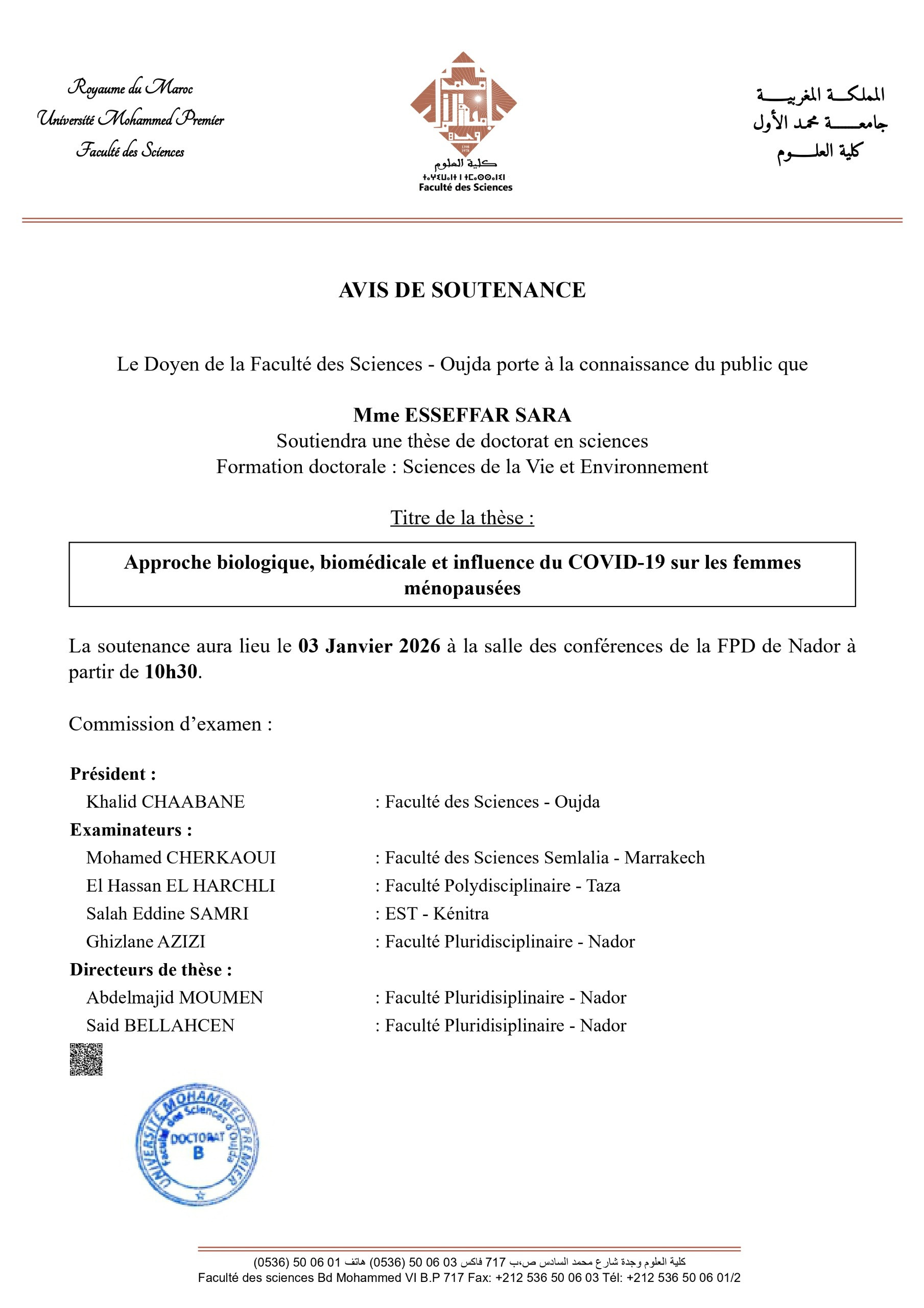 AVIS DE SOUTENANCE: Mme ESSEFFAR SARA