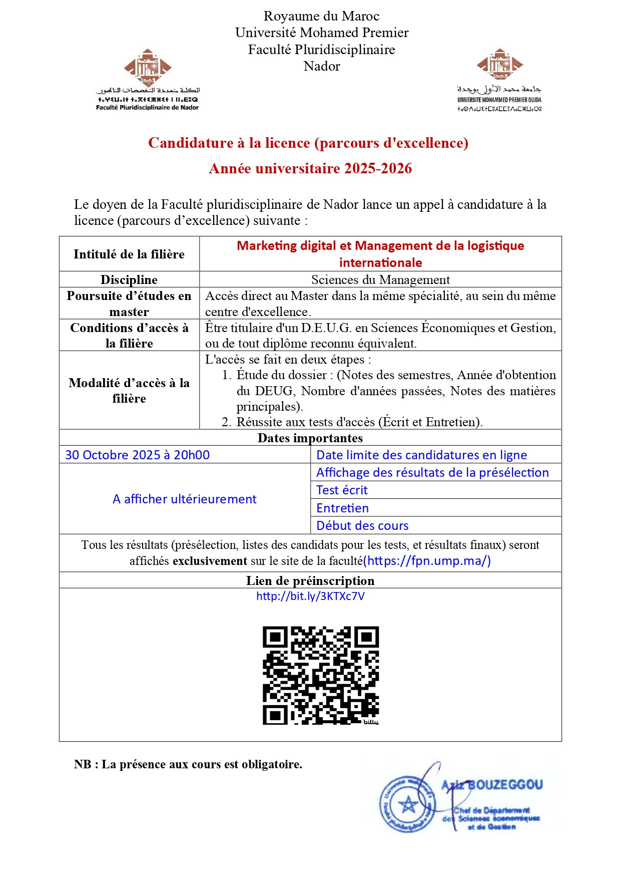 Candidature à la licence d'excellence: Marketing digital et Management de la logistique internationale - Année universitaire 2025-2026 https://bit.ly/3KTXc7V