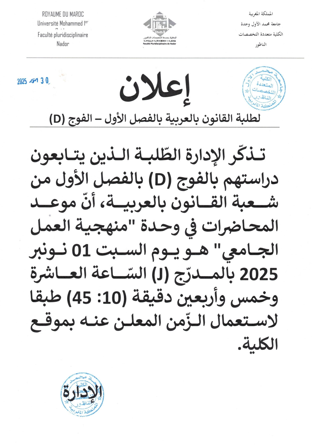 D إعلان لطلبة القانون بالعربية الفصل الأول - الفوج