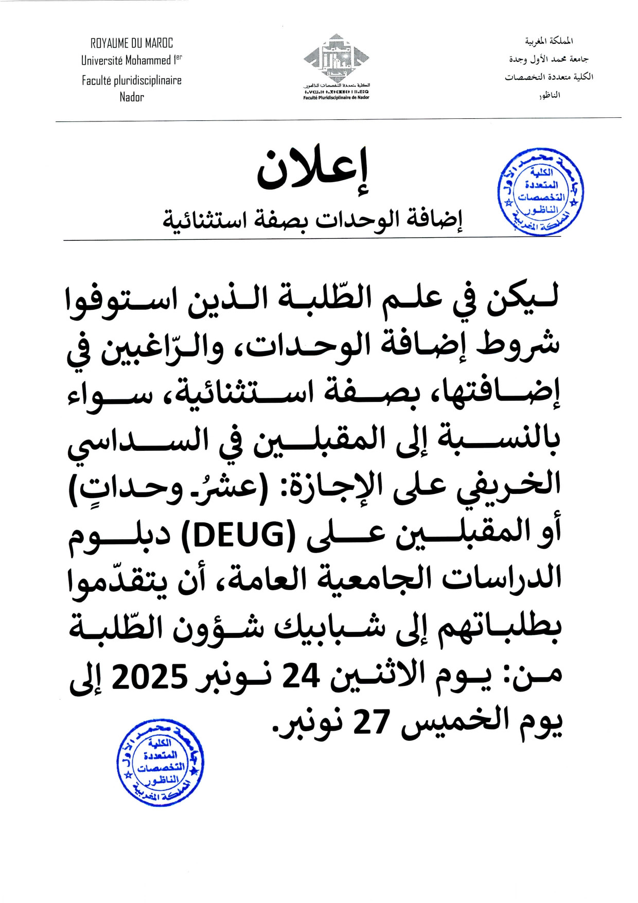 إعلان إضافة الوحدات بصفة استثنائية