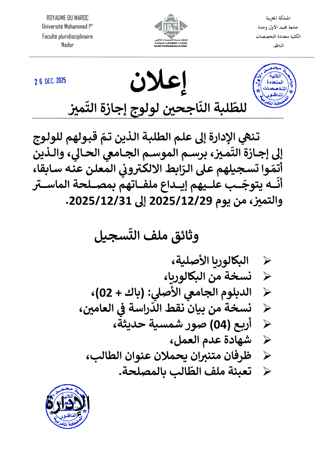 إعلان إتمام التسجيل للطلبة الناجحين في إجازة التميز