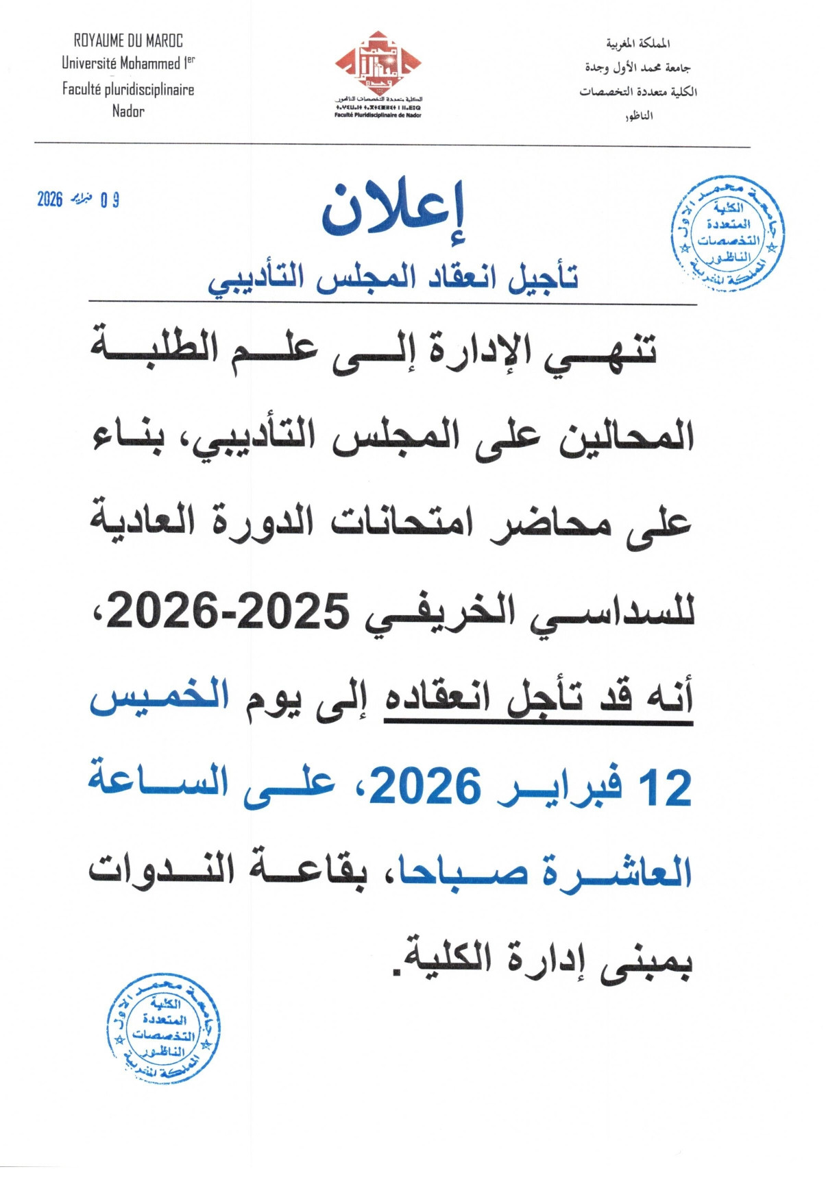 إعلان تأجيل انعقاد المجلس التأديبي