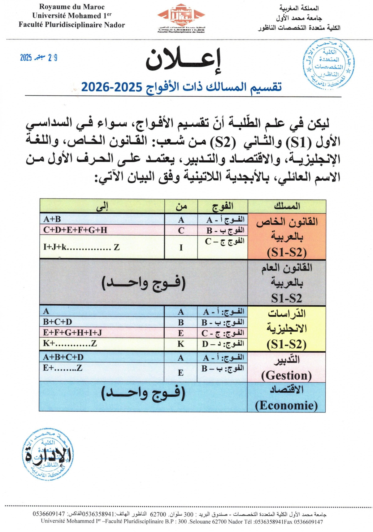 إعلان تقسيم المسالك 2025-2026