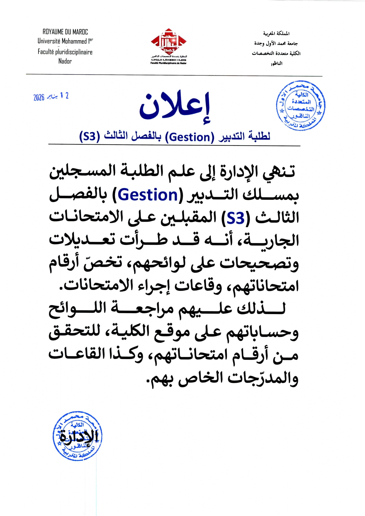 Gestion S3 إعلان لطلبة التدبير بالفصل الثالث