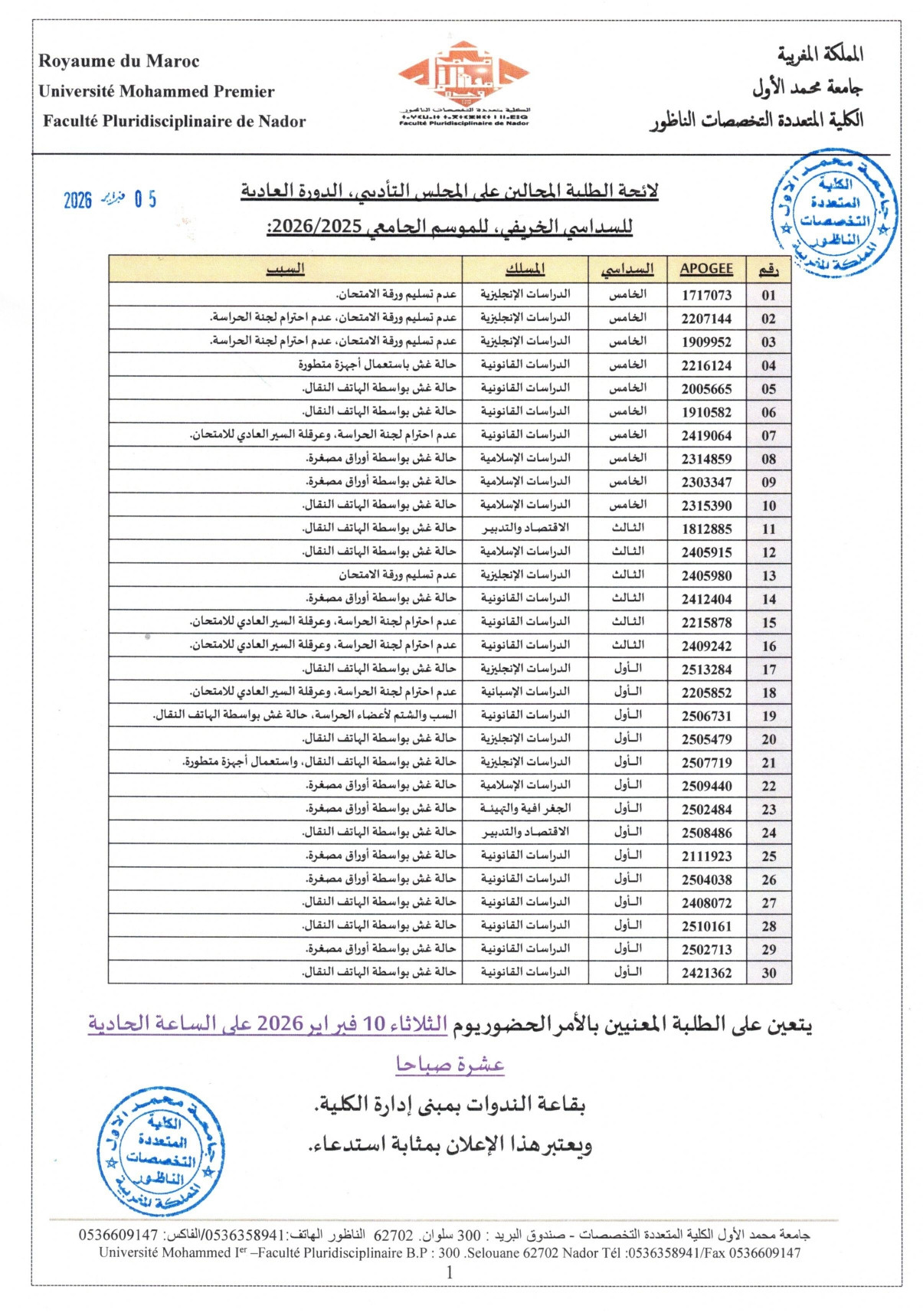 لائحة الطلبة المحالين على المجلس التأديبي الدورة العادية للسداسي الخريفي
